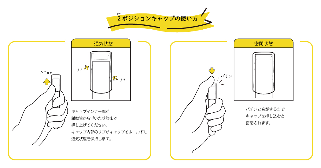 モルトン栓の取り外しやすさと、スクリューキャップの密封性を兼ね備えた試験管キャップです。キャップ内にリブがあり、試験管を片手でつかんで指でキャップの位置をずらすことによって、通気状態と密閉状態の2つのポジショニングが容易に可能です。