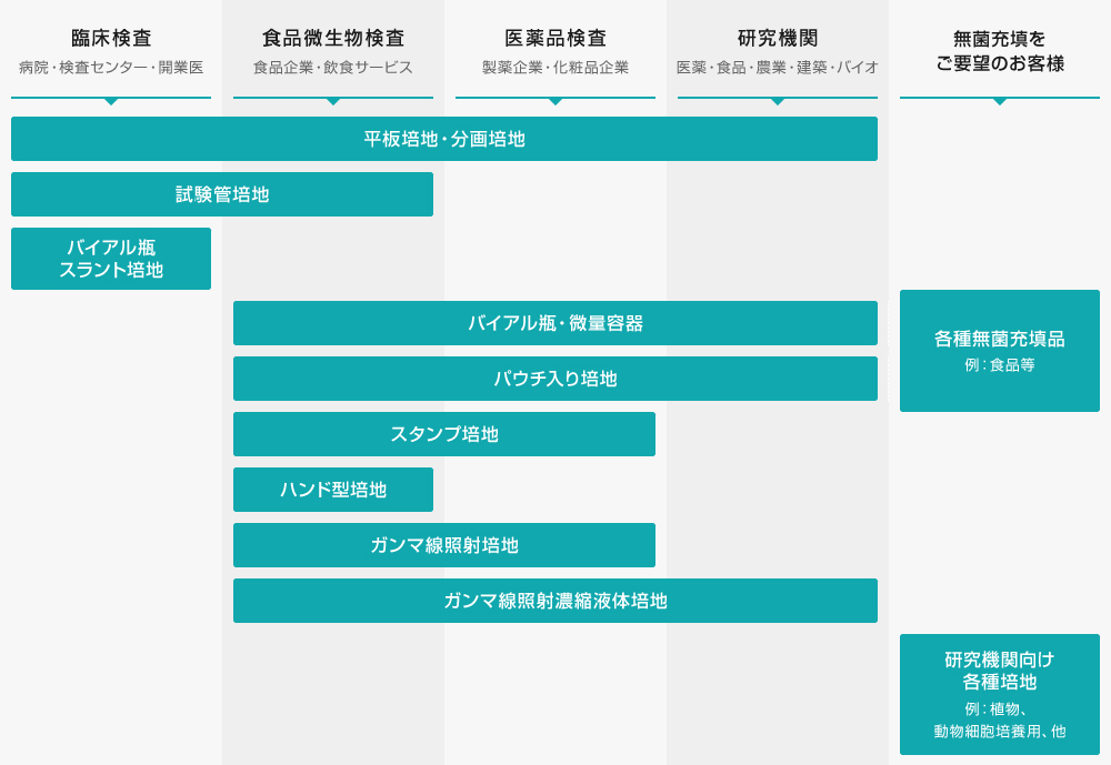 - 当社の無菌充填技術は、検査用培地のみならず多方面で活用されています。