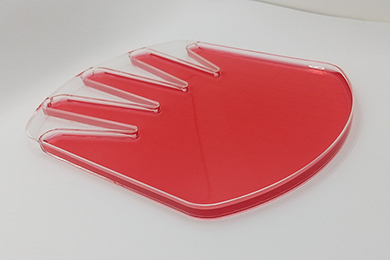 手指の菌検査用の培地です。手洗い前後に検査し効果確認に用いることにより、食品産業に従事する方々の衛生意識向上に役立ちます。