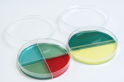 2分画培地に比べ塗抹面積はさらに狭まり、分離培養には不向きです。分離培養のためではなく、目的とする微生物の複数の鑑別項目を判定できる培地を組み合わせて使用されることが多いです。