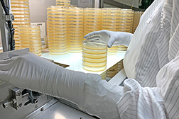 医薬品工場等のクリーンルームの環境モニタリングに、ガンマ線照射した培地がよく用いられています。平板培地用シャーレまたはスタンプ培地用シャーレに培地を無菌充填し、2重または3重に多重包装され、包装資材ごとガンマ線照射し滅菌しています。包装内部の無菌性が保証されており、パスボックス内で培地包装袋を開封し、クリーンルームに持ち込みます。